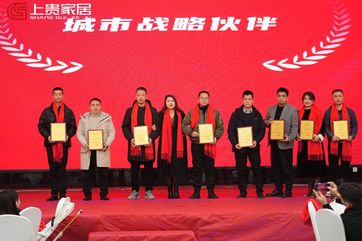 分享会伊始,四川上贵家居产业集团总经理肖红英女士登台致辞。肖总详细介绍了上贵集团目前的业务模块及发展现状,并分享了集团茁壮成长的发展历程。她强调,在过去的一年里,上贵集团经历了市场的起伏与挑战,他们始终坚守初心,以客户为中心,以质量为生命,以创新为动力,不断追求卓越。她还说,在发展历程中,每一个环节都离不开合作伙伴的鼎力相助。正因为有了大家的“携手并进”,公司才迎来了发展的新篇章。肖总为近百位全国优秀城市经销商颁发了“城市战略伙伴授权书”及年度大奖,并与获奖者合影留恋。